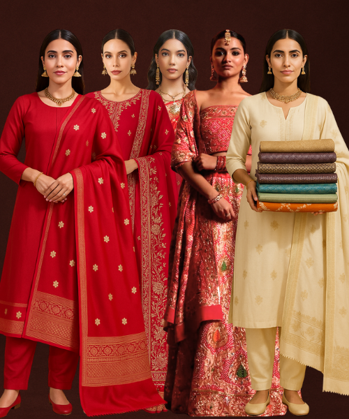 - Sarees:Â From pure Banarasi to Kanjivaram and Georgette Silk Sarees Online, our sarees blend traditional weaves with contemporary designs, ideal for every celebration.