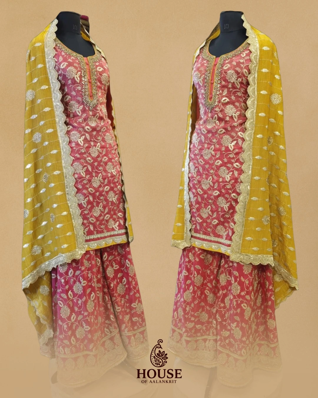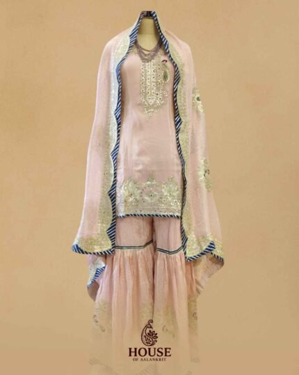 This ethereal Banarasi ensemble, handwoven with fine katan silk, blossoms with the timeless charm of Gulab Jaal motifs. The delicate zari jaal work, intertwined with soft rose-toned threads, evokes the fragrance of Mughal gardens – a poetic ode to grace and grandeur. The lustrous sharara and intricately detailed kurti together create an aura of regal femininity, perfect for those who cherish tradition wrapped in subtle luxury.